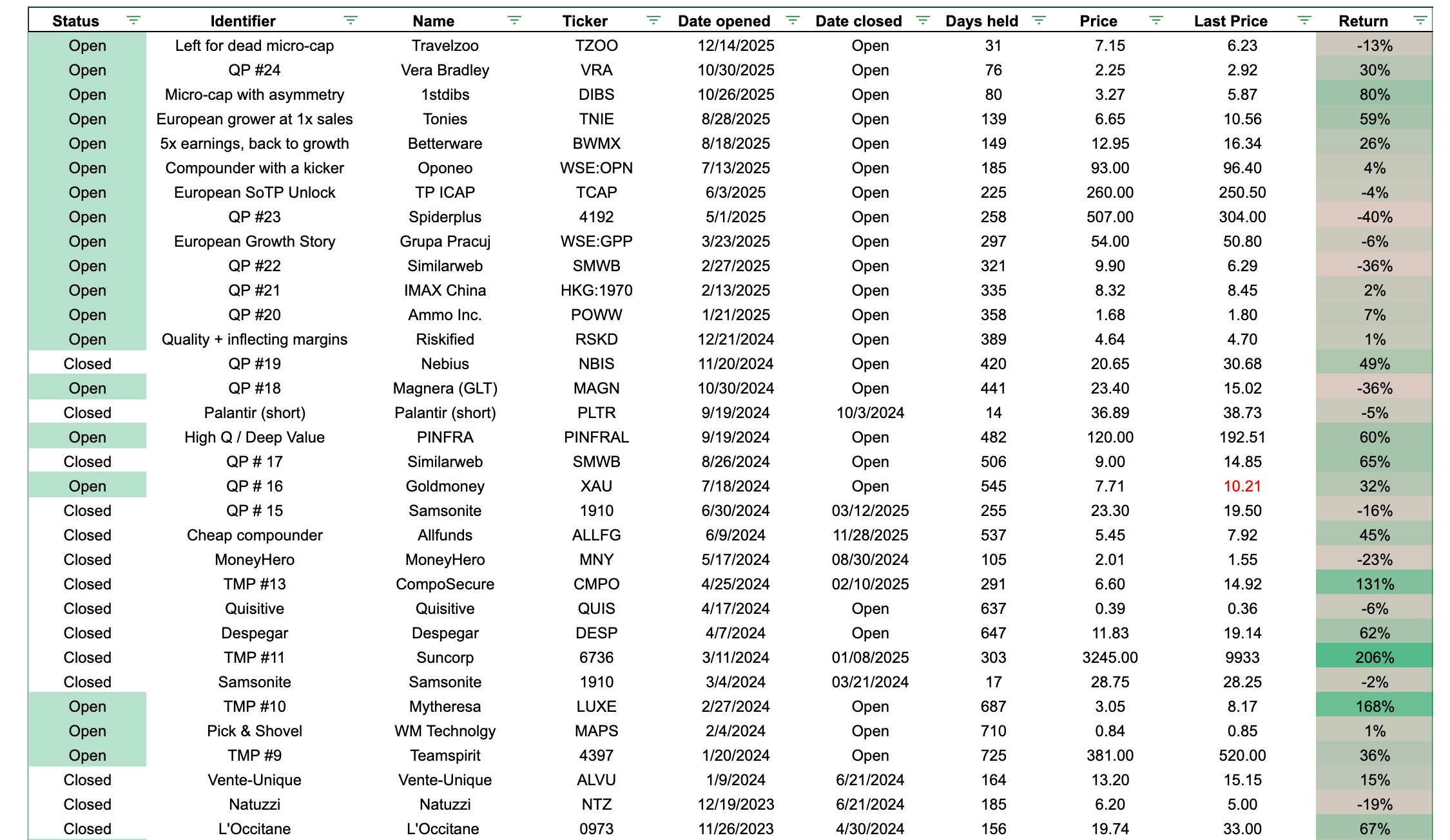 Our performance for the 2025 ideas was underwhelming. The average idea shared in 2025 returned 32%, while the average loser lost 16%. Across all names, our stocks were up ~9% for the year. [Note: these numbers are as of today, since I am relying on Google Data for its ease of use/simplicity. If looking at a hard 2025 stop, performance would be slightly worse.]