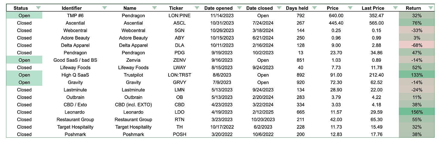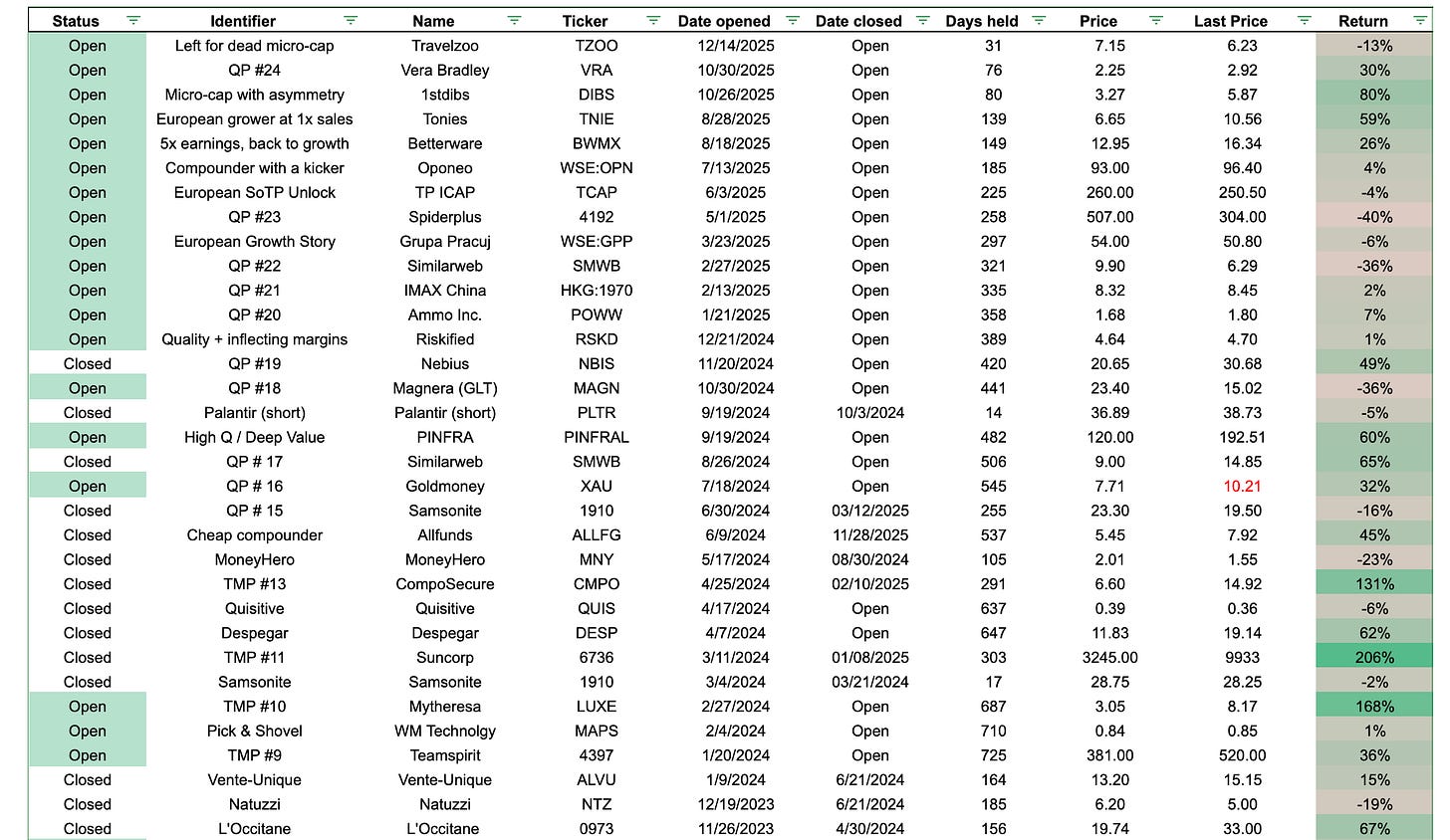 Historical performance, however, remains solid. Across all three years of writing this Substack, 66% of ideas shared have had positive returns — the average winner has returned 55%, and the losers have lost 21% on average. The average holding period has been roughly a year (340 days). Across all ideas, the average return has been 44%. Overall returns have been good thus far.