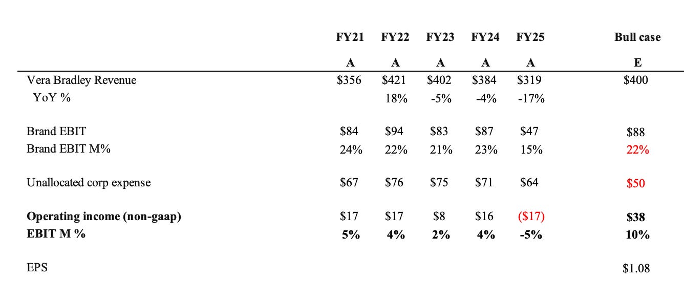 Retail concepts are always tough to model accurately. My assumptions are as follows. I think if VRA continues to make progress on its turnaround, it could return to circa FY24 profitability, which was ~$16 million in EBIT. This translates to roughly $0.45 in EPS. At a 10x multiple, this would be worth a double. VRA will also have about ~$30 million in cash, which is worth another $1.00 per share. Solid upside.