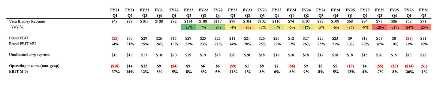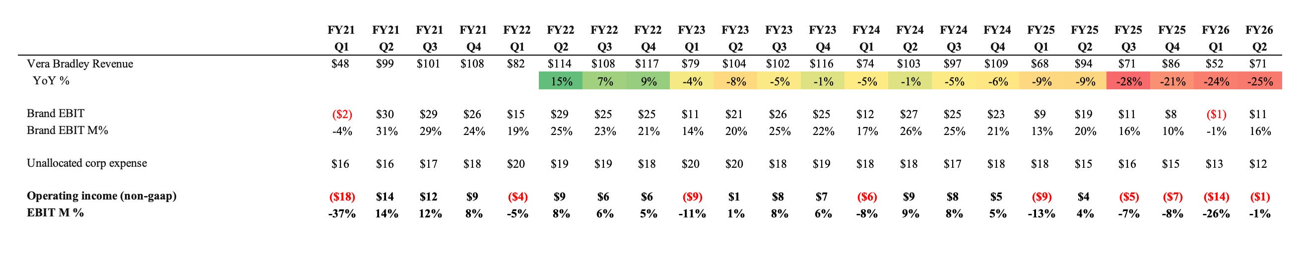 Now, I think VRA has the potential to really resonate with the consumer, given its heritage. Many brands that have leaned into the Y2K and nostalgia trends have enjoyed renewed success, including American Eagle, Ralph Lauren, and Gap. Vera Bradley was hugely popular in the early 2000s, so there is optionality here.
